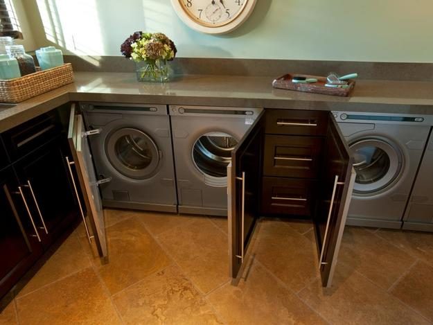 В санузле. Хороший вариант организовать место для стирки и сушки белья. Конечно, если размеры санузла позволяют (к слову, к площади ванной комнаты по закону возможно присоединить часть прихожей).На кухне. Аккуратно спрятать агрегаты для стирки и сушки за фасадами гарнитура — выход для тех, чья квартира может похвастаться просторной кухней.
