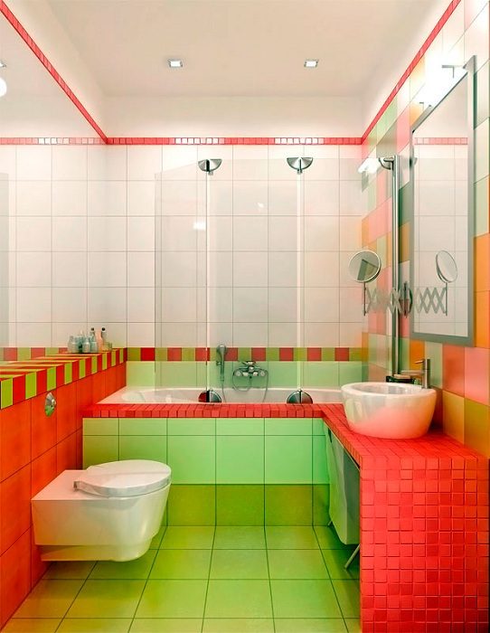 Яркая арбузная краска — сочетания зеленого и красного, то что станет пестрым и ярким дополнением к дизайну ванной.