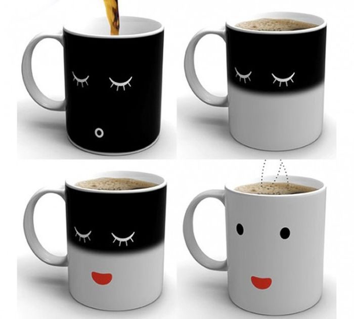 Есть кружки, которые меняют свой цвет в зависимости от того, какой температуры жидкость в них наливают. Это могут быть изначально бесцветные варианты, которые от нагревания приобретают оттенок или меняют рисунок.