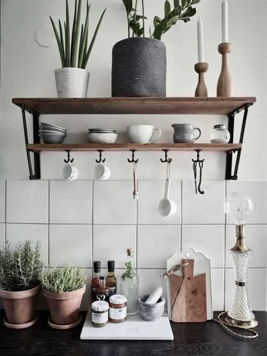 Открытые полки на кухне – это хорошо, но когда они оснащены дополнительным функциям, то это ещё лучше! Какой именно функционал? Например, крючки, на которые можно повесить половник, шумовку, чашки или другую кухонную утварь.