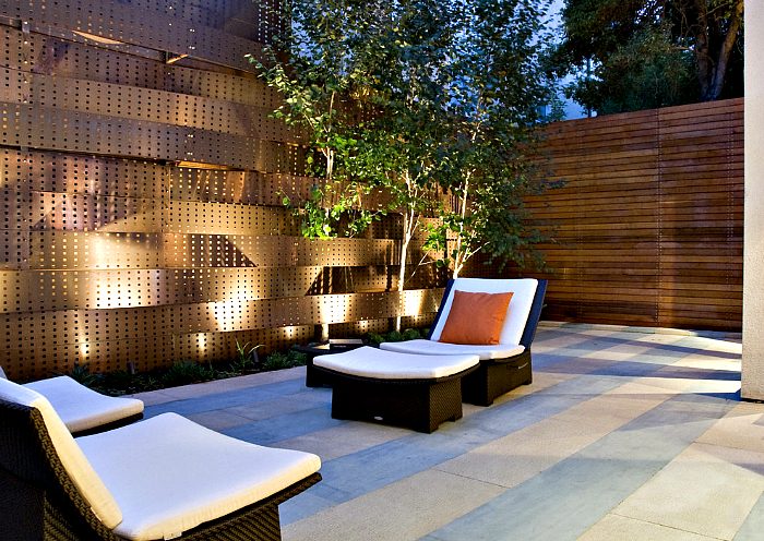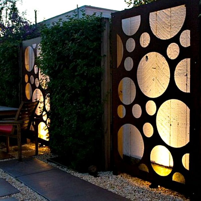 Объемное металлическое ограждение, украшенное лазерной резьбой и оснащенное подсветкой, создаст атмосферу уюта и таинственности на заднем дворе.