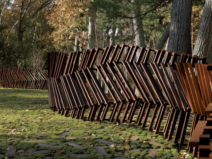 Необычное металлическое ограждение с просветами выглядит, как настоящее произведение современного искусства.