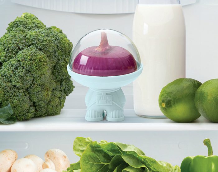 Милый контейнер в виде астронавта позволит продлить срок хранения кусочков овощей и фруктов в холодильнике.