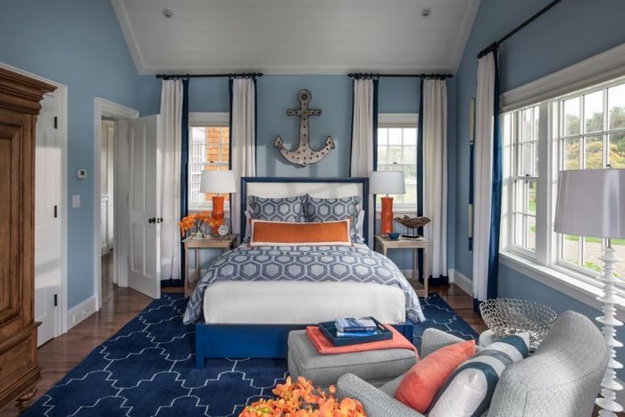 Освежить интерьер в жаркое время легко при помощи аксессуаров. Ковёр синего цвета «охладит» пространство. Морская символика напомнит о лёгком бризе, а яркие акценты оживят и сбалансируют пространство.