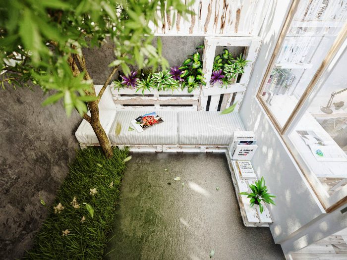 Небольшую подвесную кровать из поддонов можно использовать еще и в качестве удобного диванчика для чтения. Такую кровать можно сделать самостоятельно и разместить на любом даже самом маленьком дачном участке.