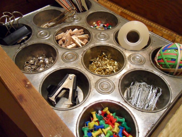 Форму для выпечки кексов можно использовать для хранения скрепок, кнопок, скоб для степлера и прочих мелочей. Такой органайзер удобней всего поместить в один из выдвижных ящиков стола, чтоб все нужное для работы всегда было под рукой.