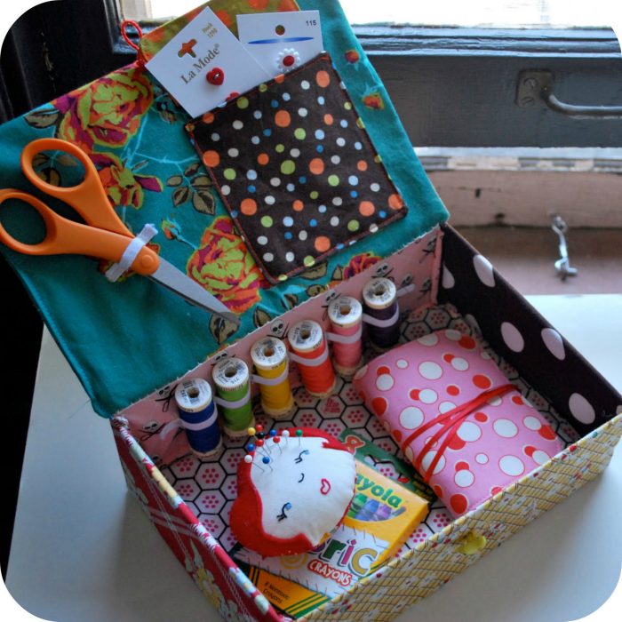 Небольшую коробку от обуви с помощью нехитрых манипуляций можно превратить в шкатулку для хранения ниток, иголок и прочих мелочей для шитья.