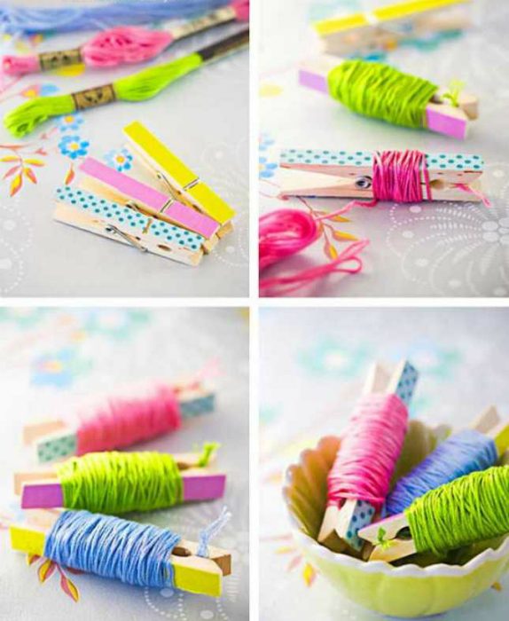 Чтобы нитки мулине не путались, накручивайте их на обычные деревянные прищепки, декорированные цветным скотчем.