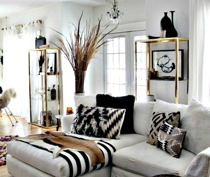 Золотые детали выгодно подчеркнут красоту и элегантность современной гостиной, оформленной в черно-белых тонах.