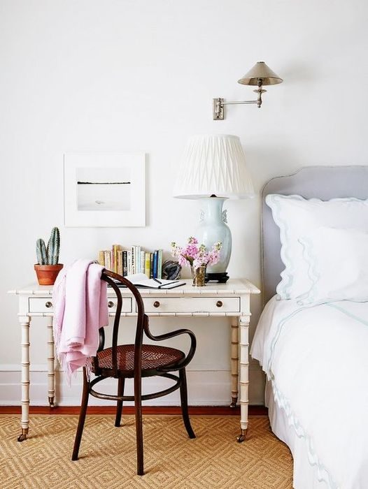 Удобным можно назвать расположение рабочего стола у кровати, вместо прикроватной тумбы. Для этих целей стоит выбирать компактную мебель, которая не будет загромождать пространство или мешать передвижению по комнате.