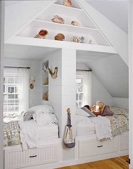 Две небольшие кровати, расположенные в фигурной нише со множеством полочек для хранения всякой всячины.