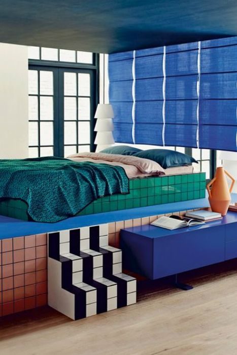 К обоям в спальне все давно привыкли, и даже покраска никого не смущает, но далеко не все готовы пойти дальше. Один из самых необычных трендов этого года – облицовка спальни плиткой. Причём, насыщенных активных оттенков, в противовес которым дизайнеры советуют использовать шёлковое постельное бельё.
