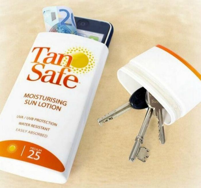 Используйте пустую бутылочку от солнцезащитного средства, чтобы спрятать ценные мелочи, находясь на пляже.