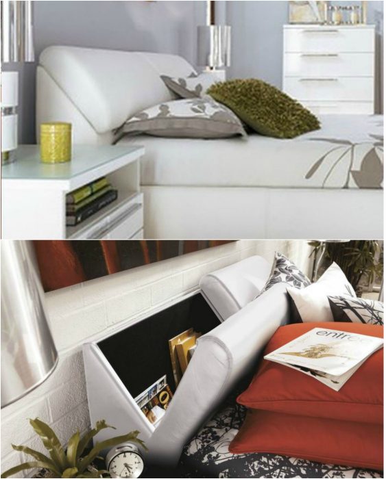 Вместительный шкафчик для хранения разных мелочей, спрятанный в изголовье кровати.