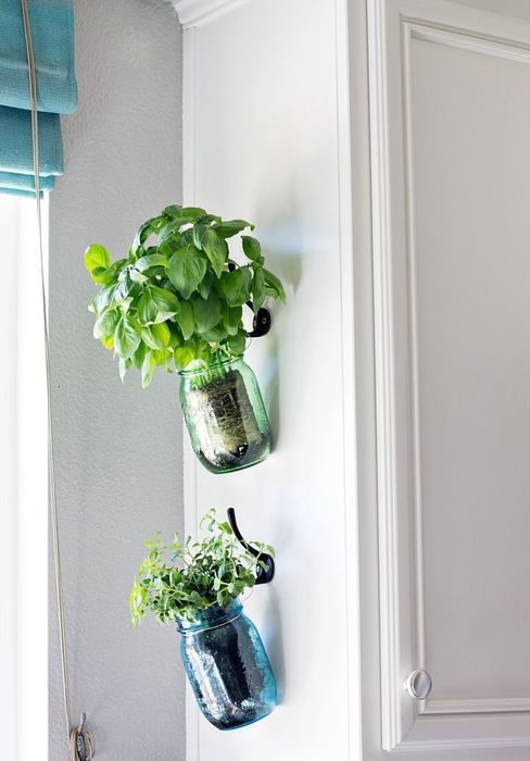 Один из самых распространённых вариантов – поставить горшки с растениями на подоконник. Для зелени можно соорудить несколько навесных открытых полок, главное, чтобы естественный свет попадал на них. Если горшков не много, их удобно расположить на кухонном столе. Функционально и стильно расположить ведёрки с зеленью на обычных рейлингах или крючках. Можно закрепить на деревянной доске горшки или банки с растениями и подписать их.