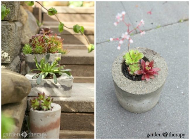 Необычную клумбу можно сделать из чего угодно. Например, декорировать бетон ненужными украшениями или посадить суккуленты и повесить всю конструкцию на стену.