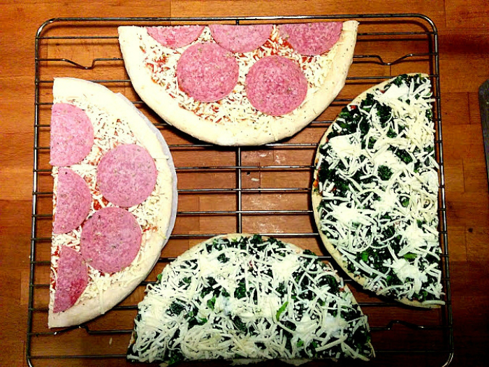 Испечь две пиццы — задача не из легких. Мало того, что их нужно приготовить, так они еще и на один противень не помещаются. Чтобы не печь их по отдельности, разрежьте пиццы пополам и разместите их в духовке так, как показано на рисунке.