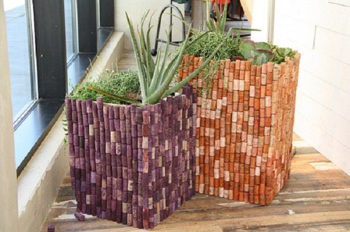 Отличный вариант создать кашпо из набора винных пробок, что усовершенствует внешний вид горшка.