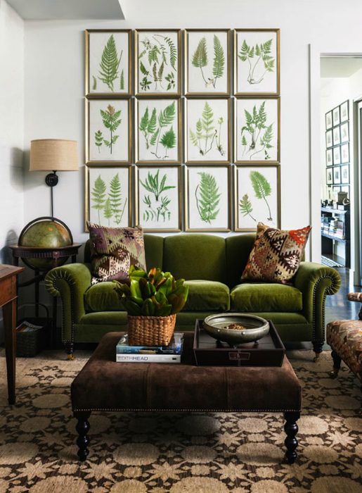 Дизайн, вдохновленный зеленой листвой: тематические картины на стенах, глобус и роскошный диван сочного зеленого цвета.