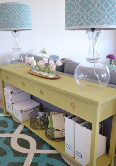 Тонкий стол, как один из возможных особенных элементов оформления комнаты для принятия гостей.