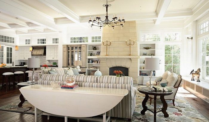 Классический интерьер и отличное сочетание диванов и столешниц — это создаст интересную атмосферу.