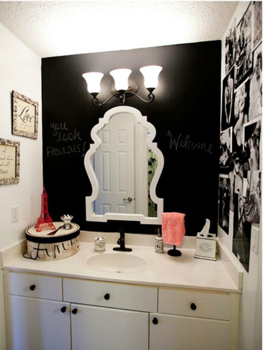 Светлую ванну можно преобразить с помощью акцентной стены. Пространство за раковиной можно покрасить в контрастный цвет и украсить тематическими плакатами.