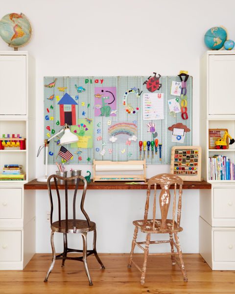 Родители позаботились о создании игрового и развивающего уголка для своих чад. Здесь имеются стеллажи для книг и игрушек, рабочее место для двоих, бумага, карандаши и фломастеры для творчества, а также магнитная доска для демонстрации результатов труда юных талантов.