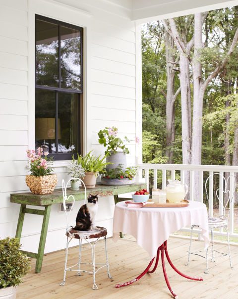 Эти винтажные стулья и столик когда-то стояли в магазинчике мороженого, а теперь разместились в уютном уголке для завтраков или перекусов на открытом воздухе.