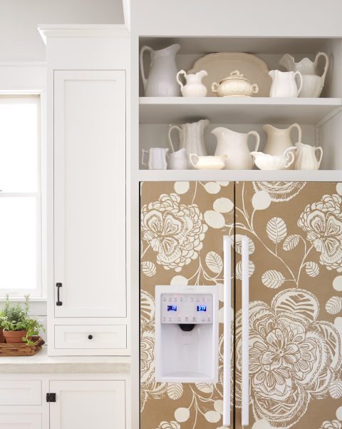 Обычный белый холодильник стал уютным акцентом после того, как его дверцы оклеили обоями с крупным цветочным рисунком.