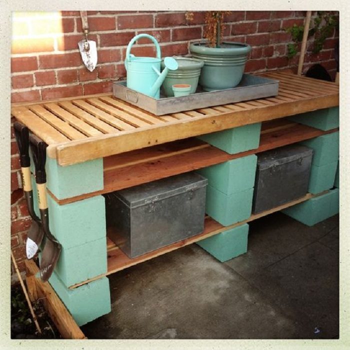 Удобный столик возможно создать при помощи шлакоблоков и ненужных досок, что станет просто оптимальным для любого двора.