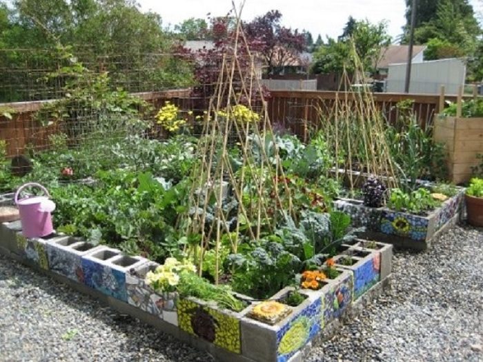Хороший вариант оформить грядки и обложить их по краям шлакоблоками, то что понравится и украсит обстановку во дворе.