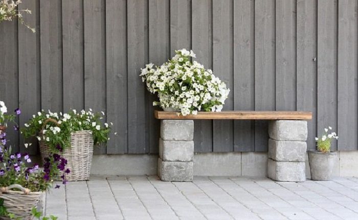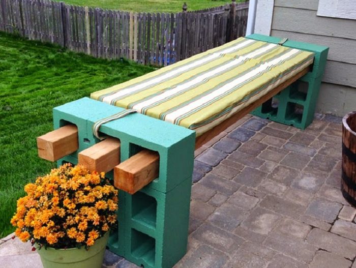 Отличный вариант создать оптимальное настроение во дворе при помощи обычных шлакоблоков и созданной благодаря им лавочке.