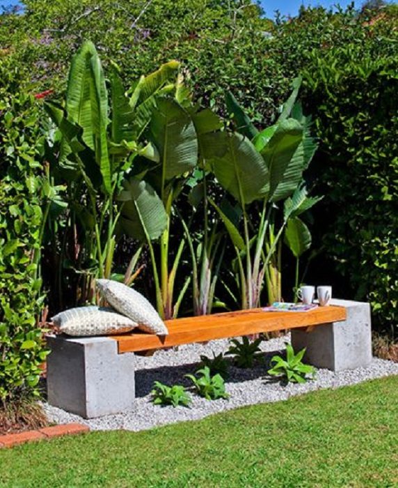 Лавочку можно создать просто при помощи досок и шлакоблоков — всё очень просто и удобно.