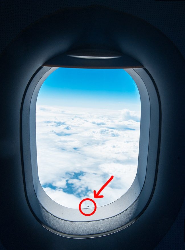 Иллюминатор состоит из двух пластиковых стекол. Из-за большой разницы давления между воздушной прослойкой между стеклами и салоном внутренний «стеклопакет» может лопнуть. Это маленькое отверстие создано как раз для того, чтобы нормализовать давление. Через него воздух отводится из межстекольного пространства или, наоборот, просачивается из салона.