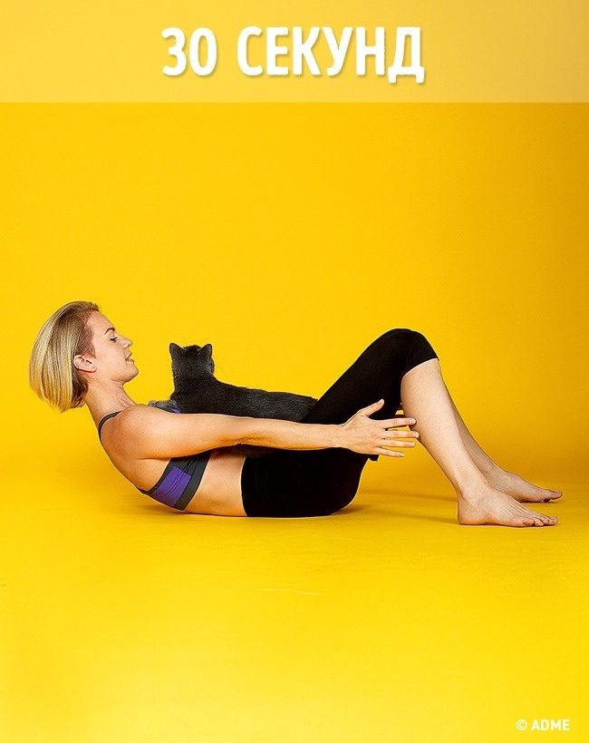 Это почти то же самое, когда вы боитесь встать, потому что на вашем животе уснул кот. Только теперь это полезно для мышц верхнего пресса. Лягте на спину и приподнимите верхнюю часть тела, при этом не отрывая поясницу от пола. Всего 3 подхода по 30 секунд.