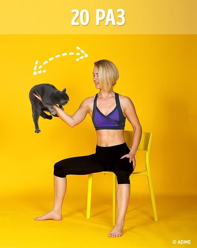 У Бориса бицепс что надо, он и ваш бицепс приведет в форму. Сядьте на стул или табуретку, а затем сгибайте вытянутую руку — 2–3 подхода по 15 раз, кот вам с этим поможет.