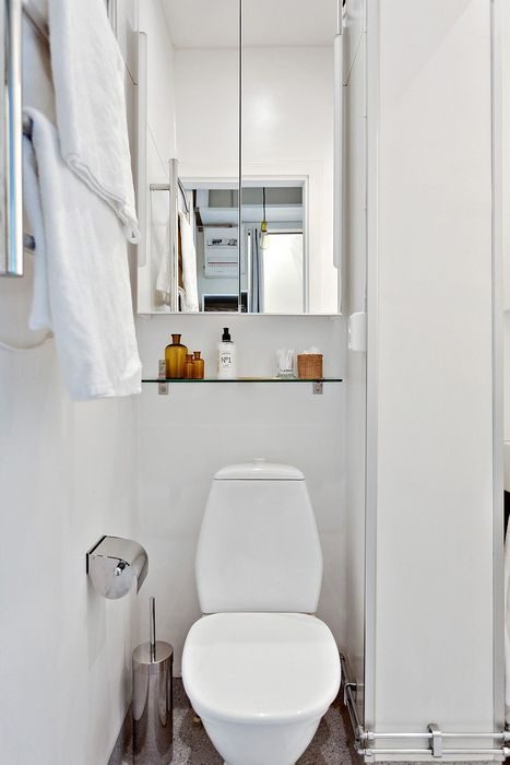 Где же в этой квартире хранят гардероб? Можно подумать, что у человека, который тут живёт вовсе нет вещей. Им отвели отдельное место в мини-прихожей, где обустроили небольшую гардеробную. Условия жизни в тесной квартире диктуют постоянно избавляться от ненужных вещей и делать свой интерьер максимально простым и лаконичным.