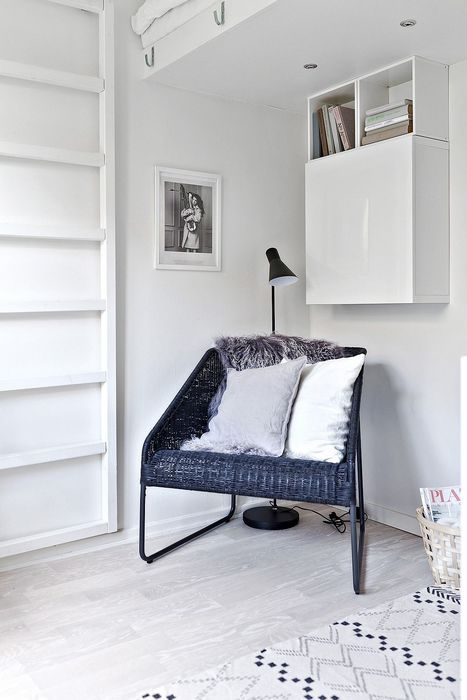 В углу около окна определили место для столовой зоны, где можно не только обедать, но и работать за ноутбуком или читать книги. А вот как таковой гостиной тут нет, вместо неё у входа в комнату стоит удобное кресло, на котором можно расположиться после долгой прогулки и отдохнуть.