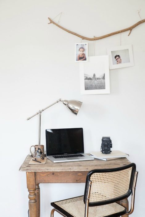 Украсить скучную стену комнаты можно с помощью небольших фотографий, прикрепленных к ветке или изломанной коряге с помощью веревок, лески или ниток.