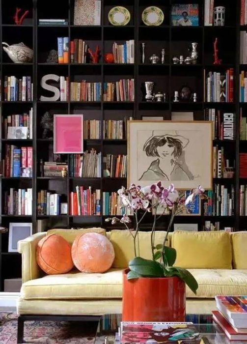 Вешать картины можно не только на стены, но и на полки и перегородки книжных шкафов.