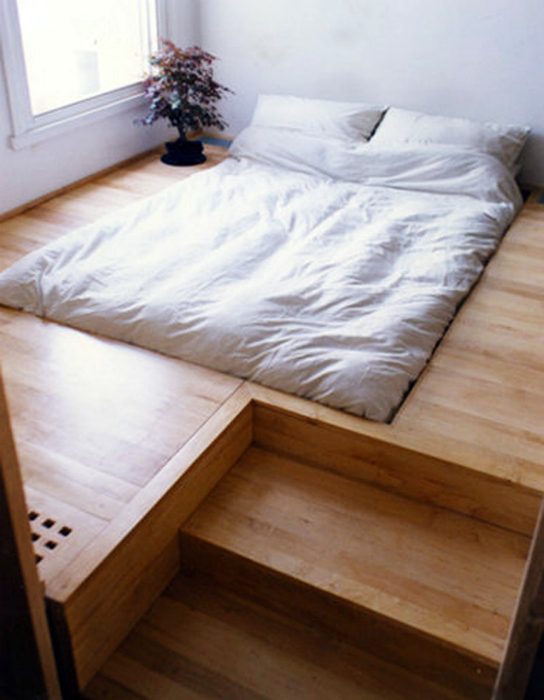 Лаконичное ложе, встроенное в деревянный подиум однозначно понравится поклонникам простоты и минимализма.