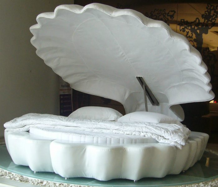 Большая круглая кровать, выполненная в виде ракушки, которую при желании можно закрыть и быть уверенным. что ваш сон точно не кто не потревожит.