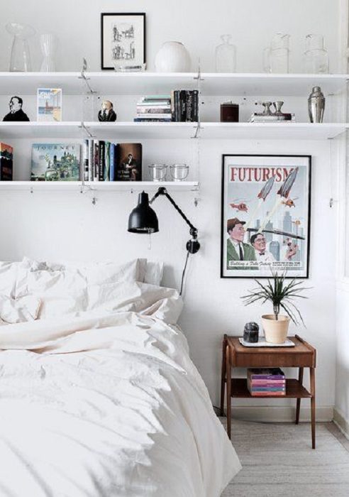 Прекрасный вариант преобразить спальню в светлых тонах при помощи обычных полок.