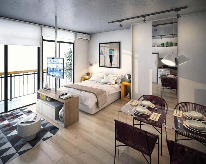 Отсутствие перегородки между кухней и комнатой, характерное для квартир-студий, может сыграть на раку владельцам маленьких квартир. На стыке кухни и жилого пространства можно обустроить обеденную зону, а интерьер оформить в популярном скандинавском стиле с минимальным количеством мебели и максимумом света.