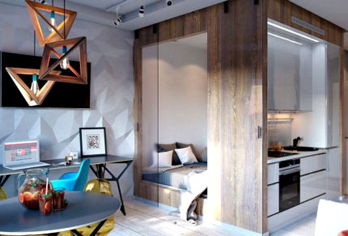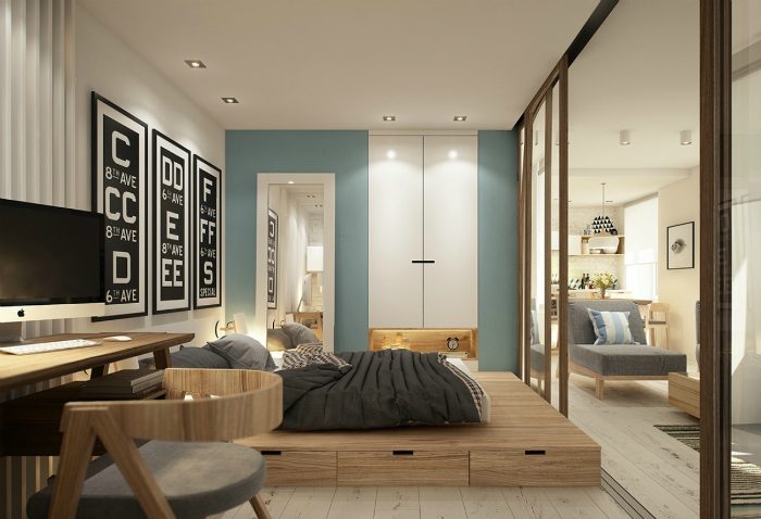 Небольшая квартира-студия со спальным местом на деревянном подиуме, скрытым за раздвижными пластиковыми перегородками и современным шкафом с абсолютно гладким фасадом — прекрасный пример организации однокомнатной квартиры.