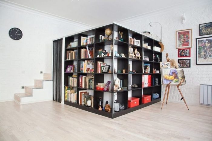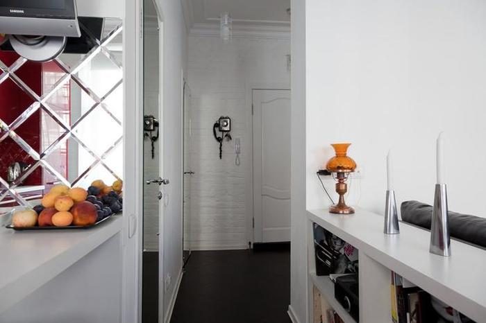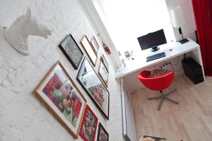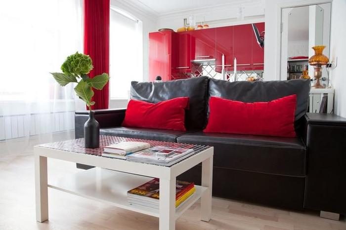 на 50 квадратов ОДНО(!!!) красное кресло-стул, черный шкаф- пылесборник, полка для кроссовок(одна пара) и закуток пить чай.