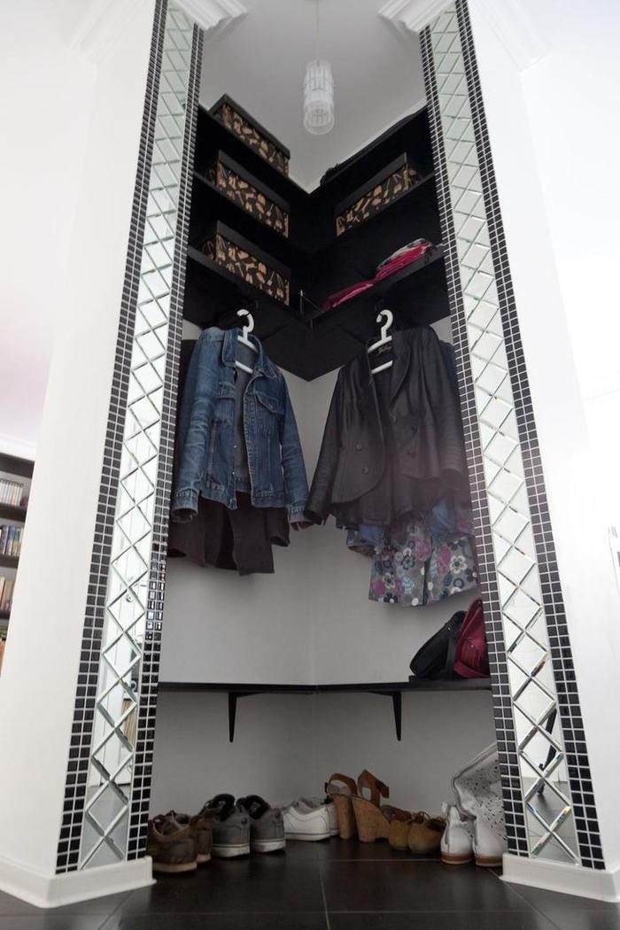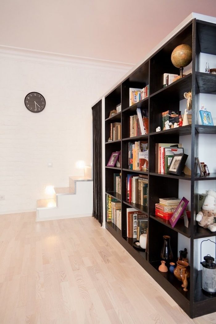 Они обратились за помощью к дизайнеру Катерине Черновой, создавшей для них богемно-гламурное пространство. Чтобы приблизить интерьер к любимой хозяевами лофтовой тематике, она снесла все внутренние стены: к счастью, ни одна их них не являлась несущей — это было нововведение советского времени. Вместо стен квартиру на части разделил функциональный черный угловой стеллаж. Благодаря большой высоте потолков спальню удалось вынести на псевдо-чердак: отдельным этажом эту зону можно назвать с трудом, так как его высота всего один метр, но хозяевам очень уютно сейчас спать в своем высоком «гнездышке».