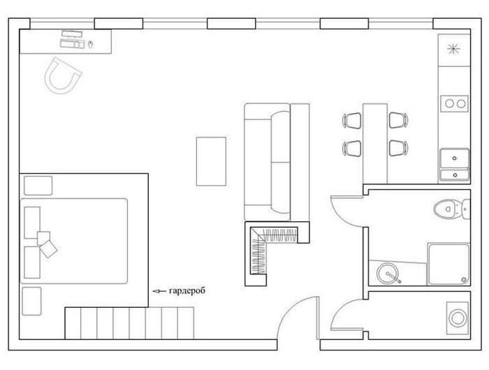 Шикарно!!! Никогда бы не подумала, что однушку можно так оформить, что всё поместилось и не тесно. Но ещё более удивило — второй этаж!!!