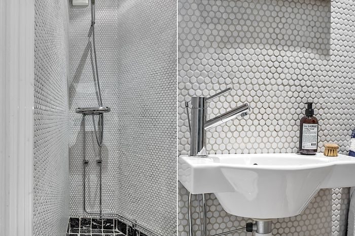 Санузлы в малогабаритках не отличаются большой площадью. В этой квартире туалет и душевая находятся в одной тесной комнатушке. Несмотря на крайне неудобную планировку здесь удалось преобразить пространство. Получилось это благодаря сантехнике нестандартных размеров, светлой мелкой плитке на стенах и тёмной квадратной плитке на полу, которая уравновешивает интерьер.