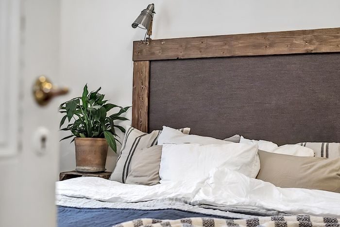 В спальне всё довольно просто, именно это цепляет и заинтересовывает. Здесь стоит винтажный шкаф, большая кровать с массивным изголовьем явно ручной работы, а функции прикроватной тумбы тут выполняет старый деревянный ящик для хранения овощей. Всё в этой квартире указывает на неординарный подход к дизайну и жизни её хозяев.